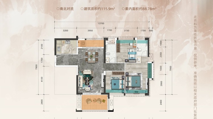 该户型布局精巧,方正舒适,尽显大宅风范