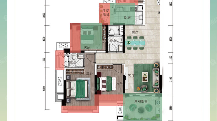 全明格局 餐客分离 观景落地窗