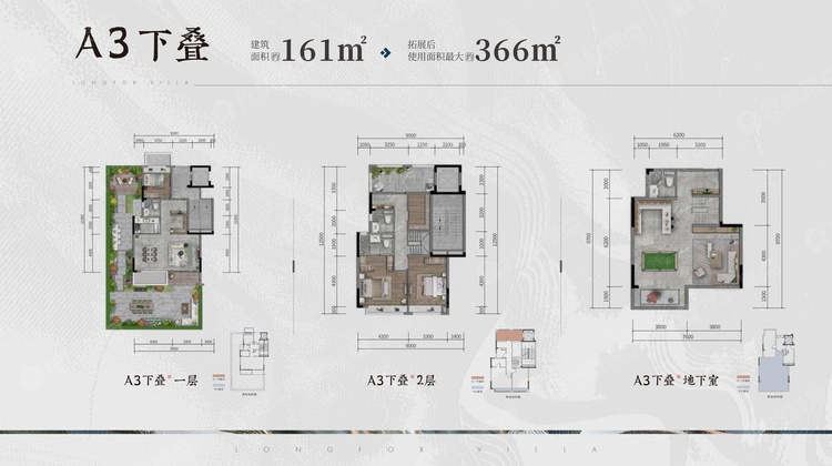 A3下叠别墅户型,楼层为1层、2层、地下室