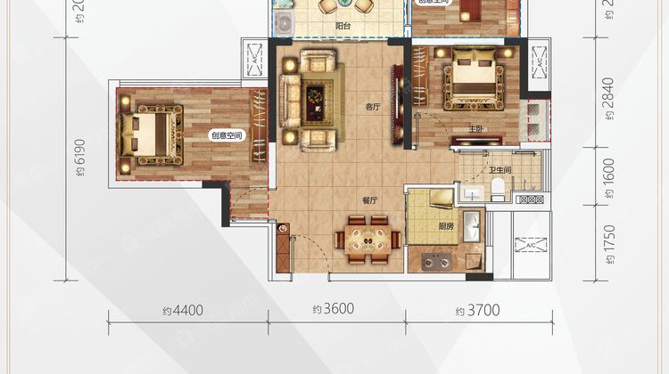 3室2厅1卫 (1单元02户型/2单元01户型)