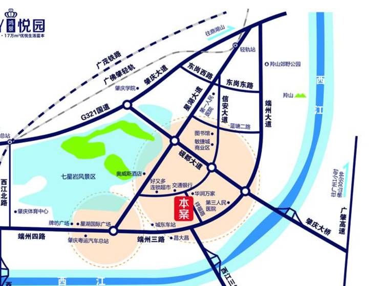 鸿景悦园位于端州区信安大道与祥福路交汇处,其总用地面积约为62287平方米,总建筑面积约为172877.9平方米。
