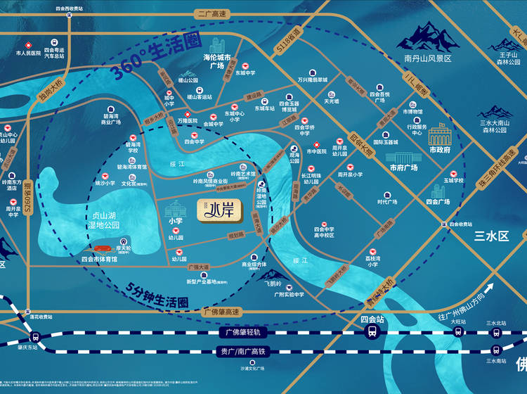 项目地处肇庆四会市贞山新城板块。贞山新城东起绥江边,西至六祖大道西侧,南达贞山山麓,北抵绥江老城对岸。贞山新城板块规划发展旅游文化、环湖生活、现代商贸等第三产业,打造宜居、易商、宜游的山水新城。该片区已建有新地标——四会市体育中心,未来还将规划建设市一级文化中心(图书馆、博物馆、艺术馆和科技展览中心等)、四会市甲级综合医院(规划中),中、小学、幼儿园近30所,随着配套逐渐丰富落地,打造成四会宜居生态新城。