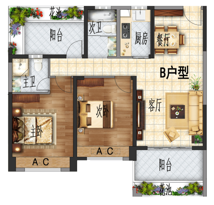 B 户型:阳光经典三居,约 102.58㎡,2+1 户型,两室两厅两卫。