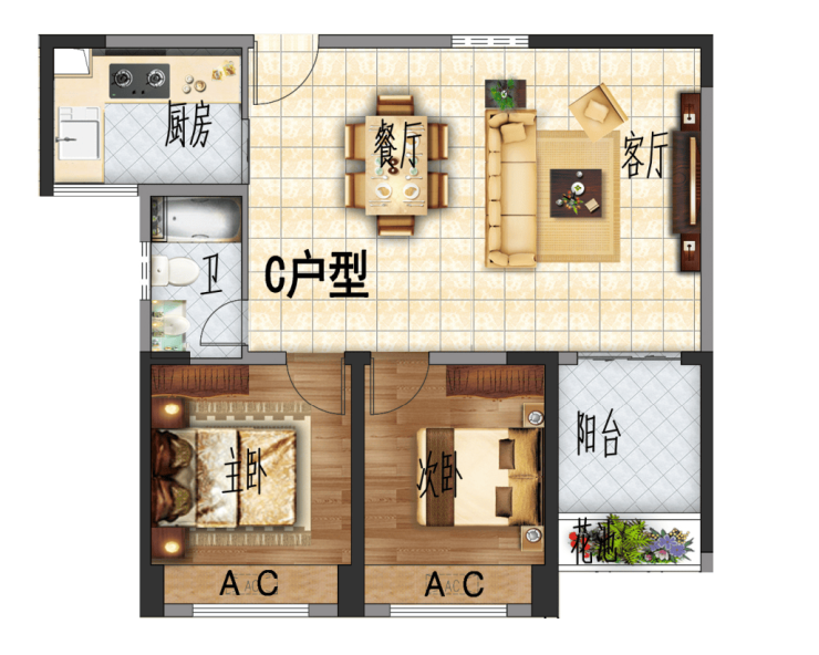 C 户型:轻奢时尚两居,约 87.4㎡,两室两厅一卫。