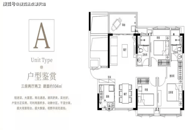在售户型:主力户型为建面约 104-109㎡的三房两厅,有 A、B、C 三种户型。A 户型和 B 户型为 104㎡,短进深、大面宽,南北通透,通风舒爽,采光好,户型方正实用,动静分区,干湿分离,有超大观景阳台和飘窗;C 户型为 109㎡,坐北朝南,客厅阳台和卧室均朝南,室内采光好,三面通透,通风佳,卧室分区,私密性好。