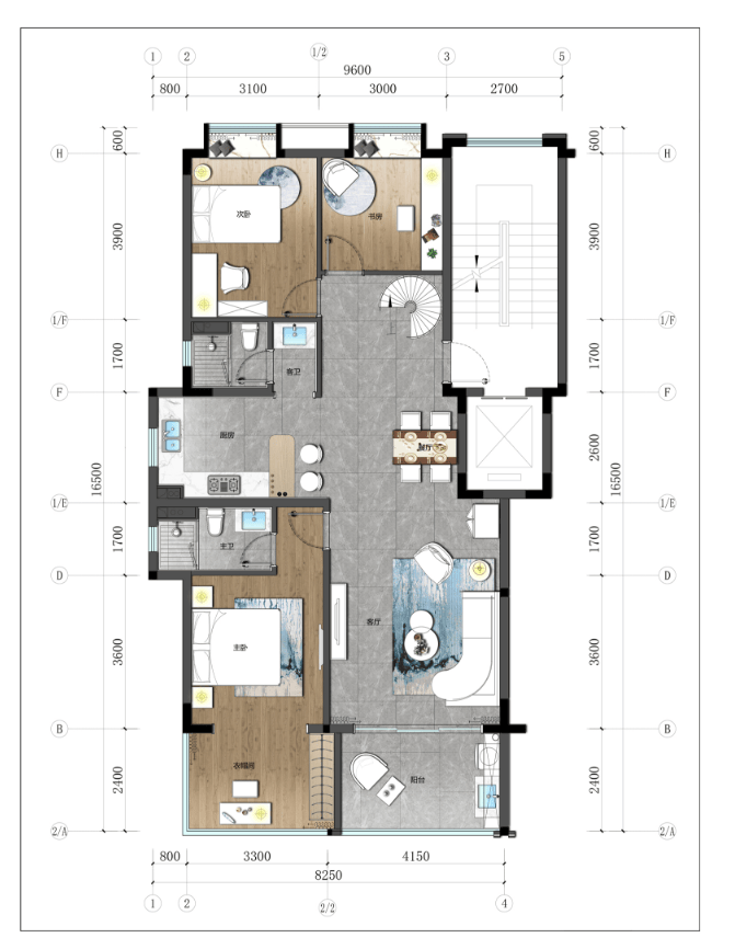 3.下叠:建筑面积约100-110㎡,四房三厅三卫。