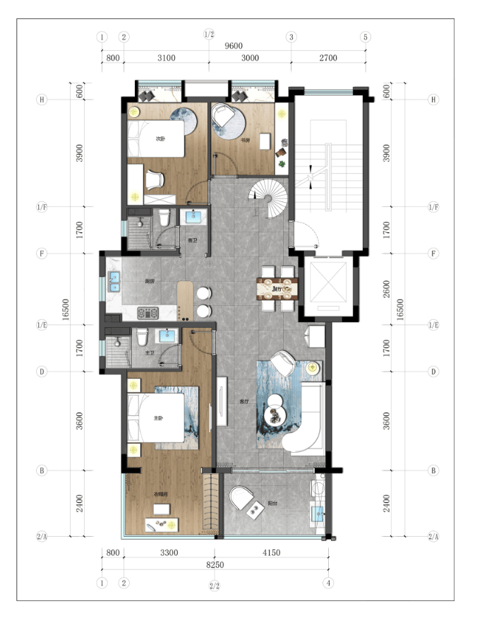 3.下叠:建筑面积约100-110㎡,四房三厅三卫。