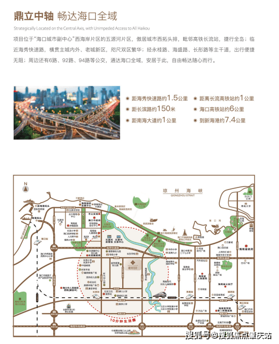 交通便捷度较高,周边直线1km内有10个公交站,公共交通出行便利;距离长流站较近(长流站-A出站口约2078m、长流站-B进站口约2180m),临近长滨路、海盛路等主干道,距离长滨路高速公路出口约1889m,沈海高速入口约3990m,兼顾公共交通与自驾出行需求,便于快速通达海口各区域。