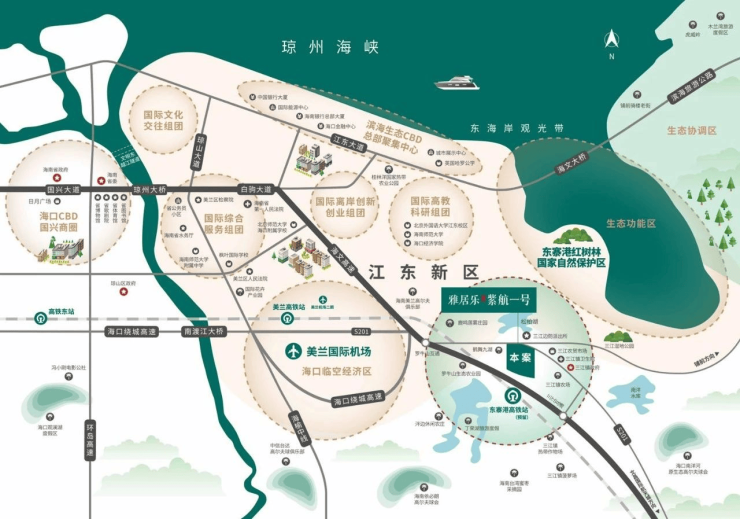 交通配套:项目紧邻海文高速公路,自驾方便。从国兴大道出发,可经琼州大桥、白驹大道、海文高速、三江互通到达项目;从高铁东站出发,可经海口绕城高速、S201 省道、海文高速、三江互通前往;从美兰国际机场出发,可经 S201 省道、海文高速、三江互通抵达;从椰海大道出发,可经海文高速、三江互通到达。