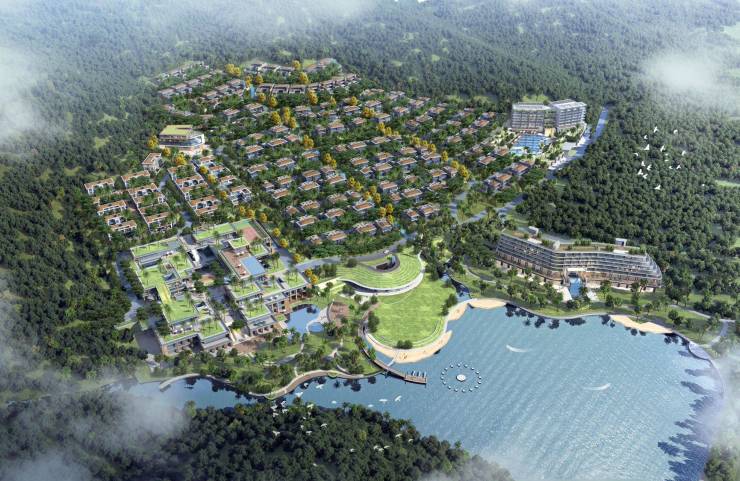 海棠春晓总建筑面积约8.23万㎡,规划190席山地墅品、一座主题度假酒店和建筑面积约1600m²湖滨扇厅。