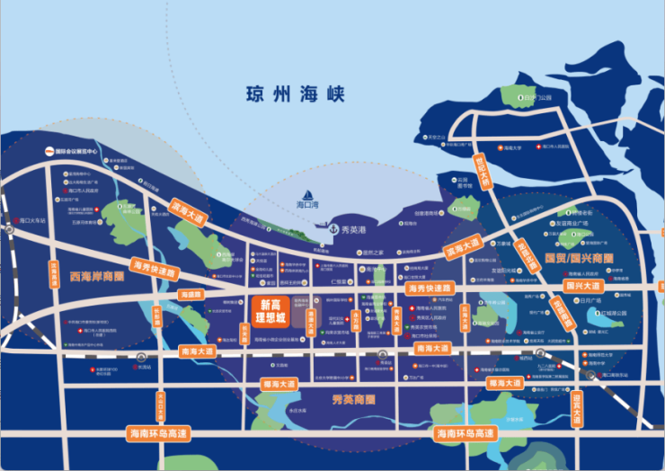 2、多维路网,无缝对接:除了海秀快速路外,项目还邻近滨海大道和南海大道这两条重要的城市干道,形成了“三横”的立体交通网络。这三条道路不仅贯穿海口东西南北,还与其他次干道、支路相互交织,构建起四通八达的交通体系。