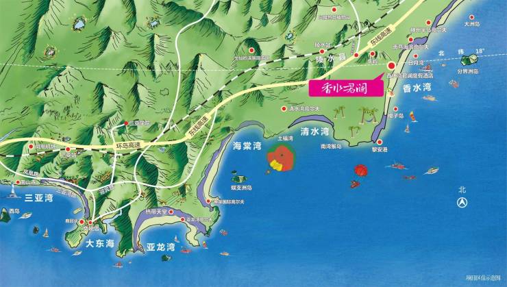 • 纬度伟置:地处神奇的北纬18°以南,中国热带第一湾,同时地处亚热带和热带的交界区域,常年平均气温25度,宜居宜度假。
