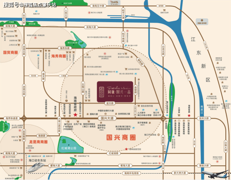 交通配套:位于国兴商务生活圈,由国兴大道、蓝天路、大英山西二街等三条城市干道及五指山路、大英山一至五路等多维路网组成,接驳海秀快速路及南大桥、海府桥两座立交桥,周边直线 1km 内有 23 个公交站,距离最近的南宝商场站仅有 162m。