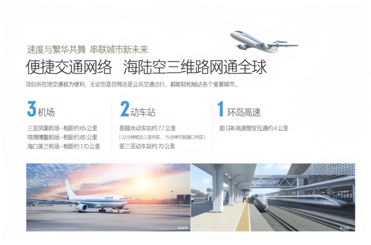 目前海南环岛动车已全线贯通,湾区内部市政公共交通、穿梭巴士等均已投入运营,多维高效交通网络,让您畅游岛内外。