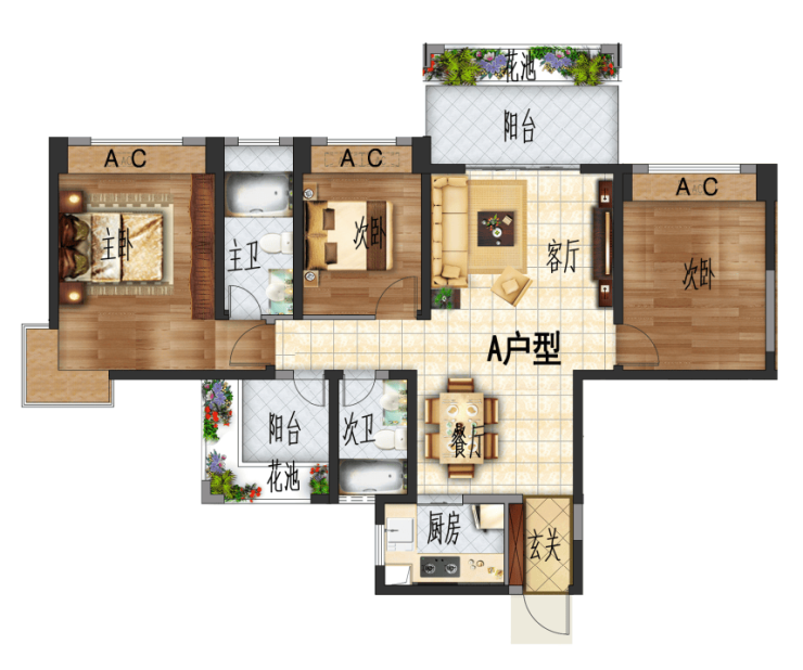 A 户型:阳光经典四居,约 120.51㎡,3+1 户型,三室两厅两卫。