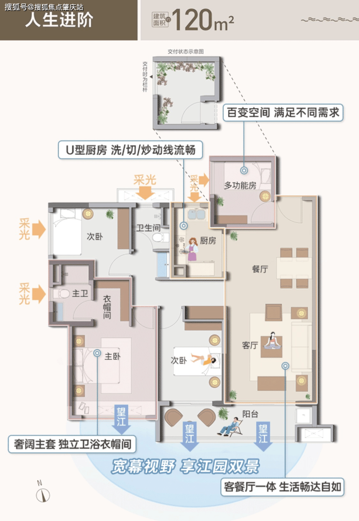 120㎡南向江园双景实用3+1房:江园双景+跨房大阳台+超大南向采光面
