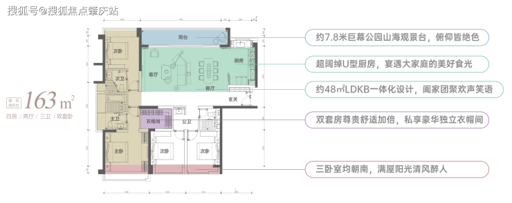 ③163㎡户型处于正品字型黄金单边位独享无遮挡的一线巨幕无界山海公园景观。