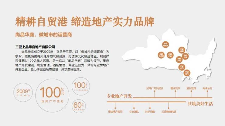 三亚上品华庭地产有限公司成立于2009年,公司实际投入资金约60亿元人民币,现资产市值超过100亿元人民币,已开发项目总面积近百万方。公司以“尚品华庭”品牌为领衔,集房地产开发建设、物业管理、酒店管理、商业运营为一体的专业房地产开发企业。