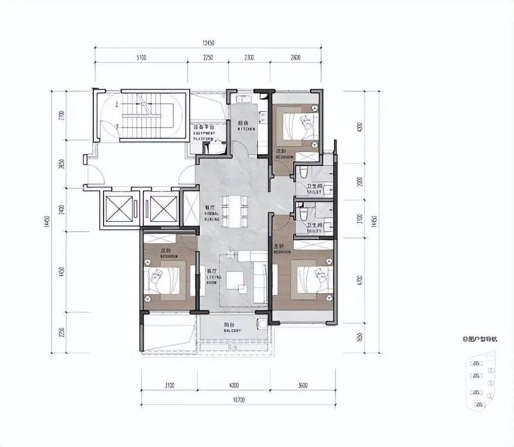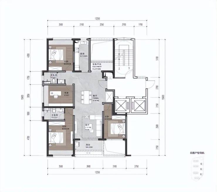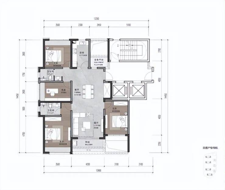 梯户比与户型:2 梯 2 户,户型面积为建筑面积 120-140 平方米的三 - 四房。