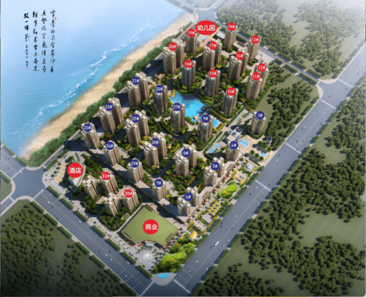 欧式建筑风格,与盈滨半岛旅游度假区隔海相望,小区处于临内海,观外海的绝佳位置,观海视野十分开阔,是理想的休闲度假生活区。