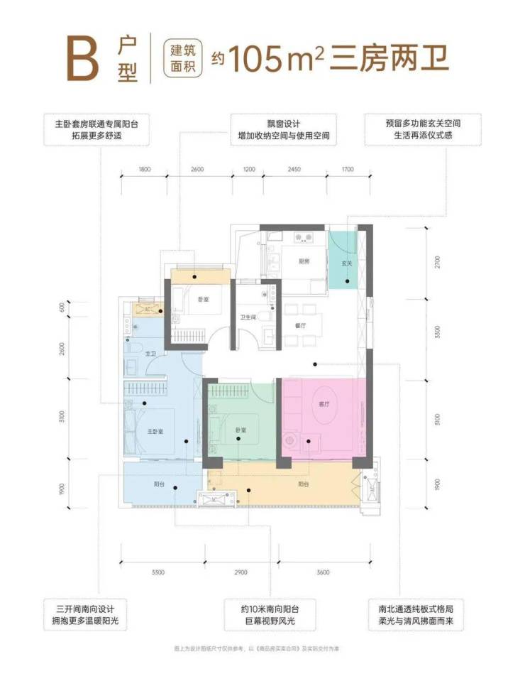 主力户型:有建面约 105㎡的三居室和 124㎡的三居室,均为南北向板楼结构,三开间朝南,拥有约 10 米超宽南向阳台,约 1.9 米进深。