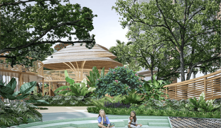以海岛肌理水母造型打造童话森林乐园,涵盖剧场舞台、水母建筑娱乐、儿童攀爬坡道、森林木桥等,同时结合架空层打造童梦天地空间、育儿互动空间两大空间,为亲子提供缤纷游乐设施与创意游戏区。