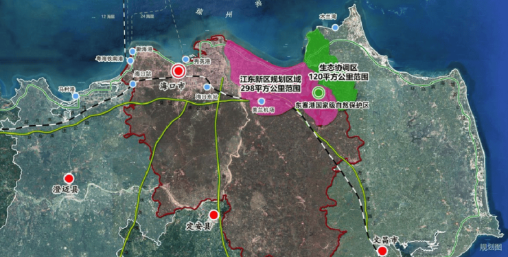 海口江东新区由中央直接部署,高规格、高标准打造,自贸港首批11个重点园区之一,约298平方公里史诗级规划面积,依托“一港双心四组团”空间格局,聚焦“4+X”产业规划,大力发展总部经济,土地规划蓝绿空间(水域、公园用地)占比达70%以上,拥有全长约31公里艺术地标海岸线,16个大师级地标性公共驿站,打造全球卓越生态环境。