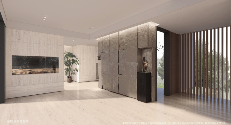 项目采取一轴(度假七境)、一环(600米雨林康养环)、九大院落(禅意雅趣)的归家动线尊享设计,入户采用双大堂设计,赋予居者尊崇的格调生活及归家仪式感。