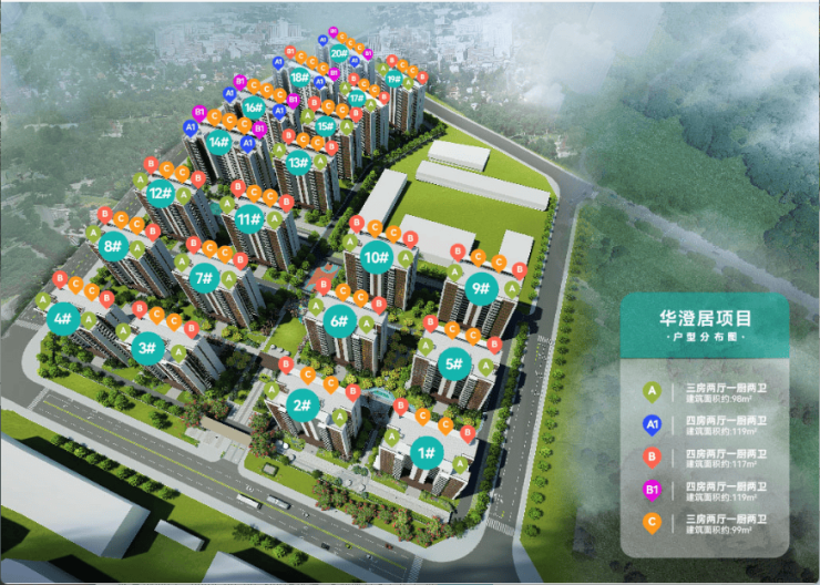 在售户型:约98㎡、99㎡三房两厅两卫、117㎡四房两厅两卫;