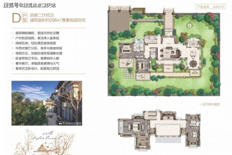 【户型面积】D户型:建面为296平米四房户型,花园面积为495-800平米