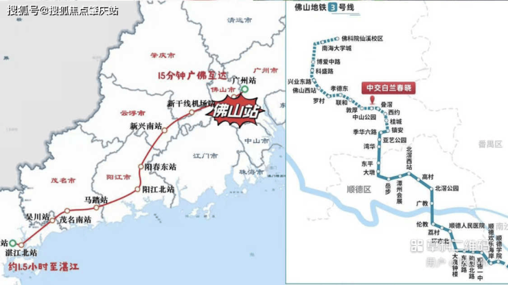 3、交通网络:双TOD加持 多维通达广佛项目周边构建“三横三纵”主干路网,出行高效顺畅。紧邻佛山地铁3号线中山公园站(直线距离约600米),临近规划中的5号、7号线及广州地铁28号线。距广湛高铁佛山站仅1.7公里,未来一站直达广州中心城区,25分钟抵达白云国际机场,真正实现湾区快速互联。