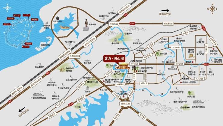 海南富力·阅山湖,位于海南西部中心城市儋州市主干道中兴大道西段。交通便捷,从阅山湖到万洋高速出入口仅 2 公里,海南西线高速、环岛高铁贯穿境内,项目距离白马井高铁站约 35 公里,距儋州机场(在建中)车程约 30 分钟,距离海口约 120 公里,距离三亚约 220 公里。项目周边规划为儋州市城西核心功能区,是政府重点打造的那大主城区重要组成部分,未来将形成集高端住宅、教育医疗、休闲娱乐、商业百货为一体的城市综合体。项目依托优美原生态山、湖资源,西依马鞍岭、儋阳楼,北眺云月湖,西南临近儋州母亲河——雅拉河,南临儋州一小、海南西部中学、儋耳学校、海南大学儋州校区,结合项目周边山景、湖景及教育资源,打造为儋州首个人文豪宅标杆项目。