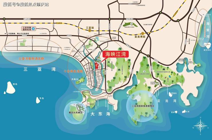 便捷交通:海映江湾项目位于河东路,北接迎宾路,南至鸿洲游艇码头,居三亚城市主干道解放路与凤凰路之间,距离三亚湾直线距离仅1.3公里,距离三亚汽车站约1.4公里,车程约6分钟,距离三亚凤凰岛约2公里,距离大东海旅游区约5公里,车程约13分钟,距离凤凰国际机场14公里,车程约37分钟。距离海棠湾约26公里,车程约40分钟。