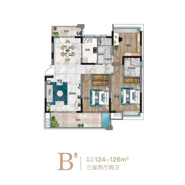 B户型亮点:全能三房,户型方正,宽景阳台规划温泉泡池