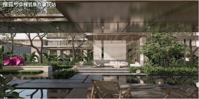 景观设计:斥巨资打造入口景观,地面石材通铺,3 棵 20 年树龄的小叶榄仁搭配 6 棵 10 年树龄的黄花风铃木,组成景观大道。近 400㎡的环岛前庭,采用超 5000 块厚 5 公分、三种不同纹理的花岗岩方石铺地,两座定制款名贵海浪灰奢石门柱,中心处设发光玉石圆盘,还有超百年树龄的古桩铁冬青。