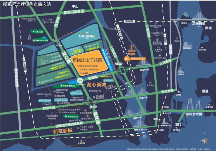 珠海西拓首站、湖心新城要塞枢纽,紧邻香海桥湖心路出口,目前已全线通车,从项目出发,20分钟通达主城区,毗邻鹤州珠海中心站CBD,距离项目约5公里珠海中心站(鹤洲)。
