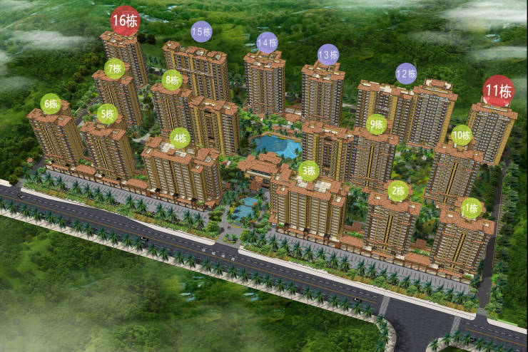 注:红色标注的楼栋为在售房屋;蓝色标注的楼栋为未售房屋;绿色标注的楼栋为已售房屋。