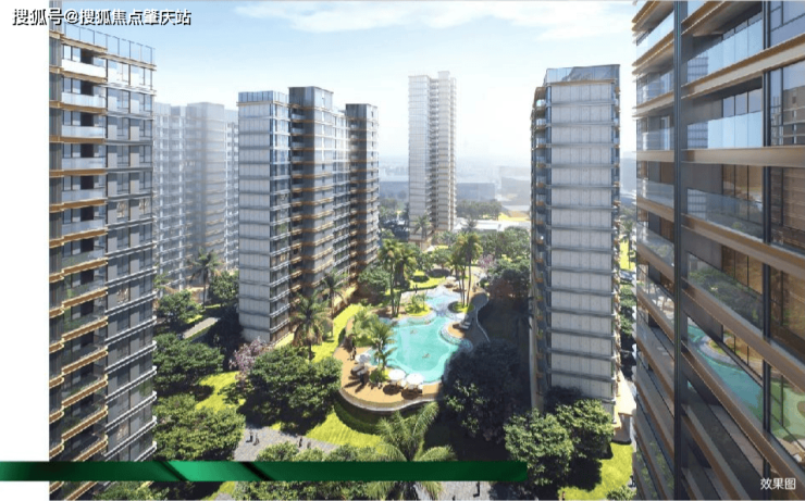 新加坡度假风园林,含中央水景、阳光草坪、儿童乐园、老年活动区。