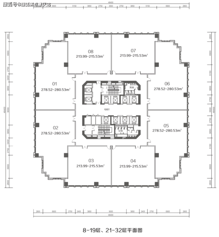 标准层产权单位:约213.98—278.52㎡/间