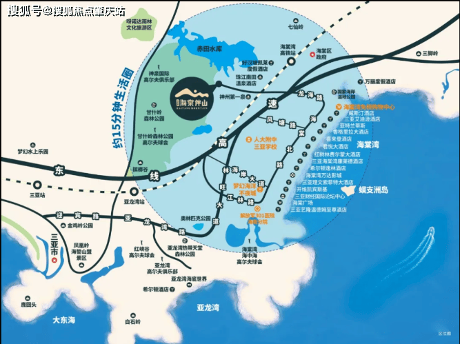 交通:距离凤凰机场 44 公里、高铁三亚站 38 公里、亚龙湾站 23 公里,近距轻轨海棠湾站,通达绕城高速、海榆东线、东线高速与 224 国道。周边直线 2km 内有 9 个公交站。