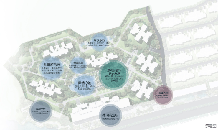 园林6大主题空间串联,包括景观会客厅、戏水乐园、长者乐园、风情泳池、儿童游乐园和观湖平台,兼顾功能性和观赏性,打造具有温馨感、品质感、艺术感的空间体验,为业主提供一个鲜活的园林生活空间。