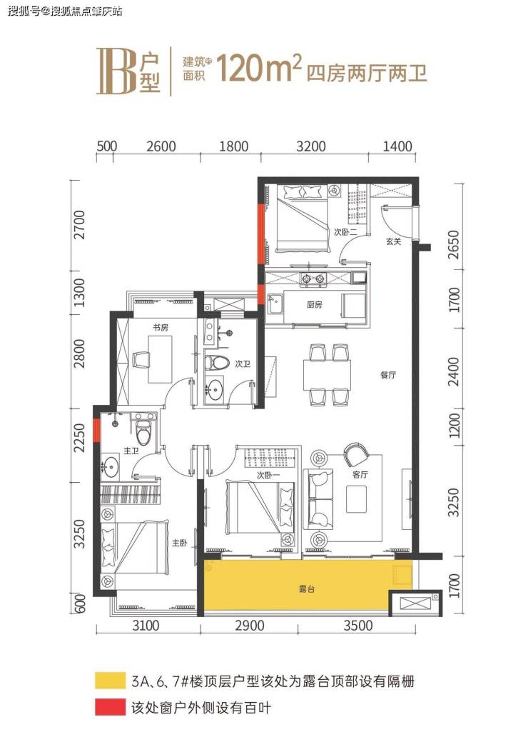 在售户型:建筑面积约100㎡三房两厅两卫、约120㎡四房两厅两卫