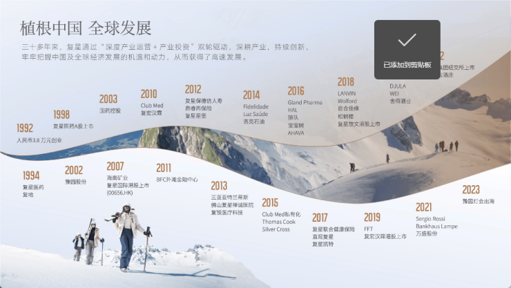 创立于1992年,复星持续深耕健康、快乐、富足、智造四大业务板块,为全球家庭客户提供高品质的产品和服务。