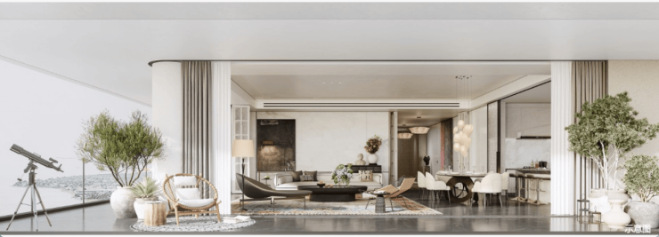南北通透,超阔南向开间、内外景致无限交融,一切服务于奢适至上,从光影、视野、体感等营造纯粹阔绰的空间格局。