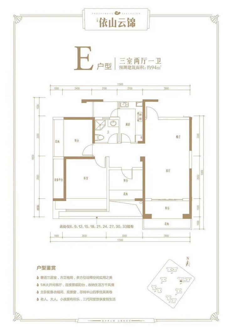 •🔥E户型三房两厅一卫: