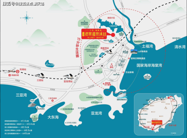 交通出行:距免税城 6.5 公里约 10 分钟车程,距解放军 301 医院 17 公里约 25 分钟车程,距未来开通的海棠湾高铁站 5 分钟车程,距三亚市中心及凤凰机场 45 公里约 45 分钟车程。