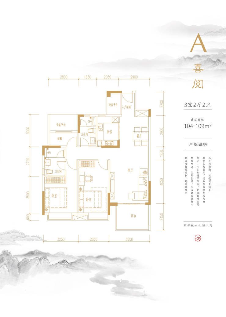 【A户型】:建筑面积约104-109㎡,3室2厅2卫