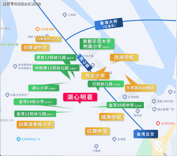 湖心新城规划27所全龄段学府正加速兑现中,目前,项目周边2km内已落成湖心小学、金茂中小学、城南中小学、齐正小学等。(来源:珠海西部中心城区A片区控制性详细规划(2017年修编)