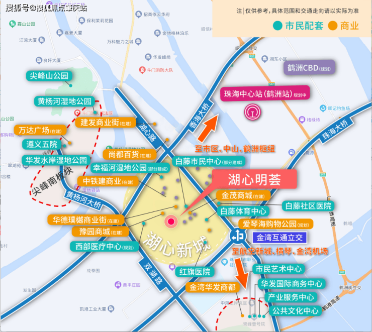 湖心明荟雄踞西部交通枢纽核心:湖心路、双湖路双主轴连通南北,珠海大桥、香海大桥(2022年已正式通车)、洪鹤大桥横跨东西,斗门至香洲实现约15分钟高效通勤,约30分钟达横琴通关澳门、约35分钟到港珠澳大桥人工岛。