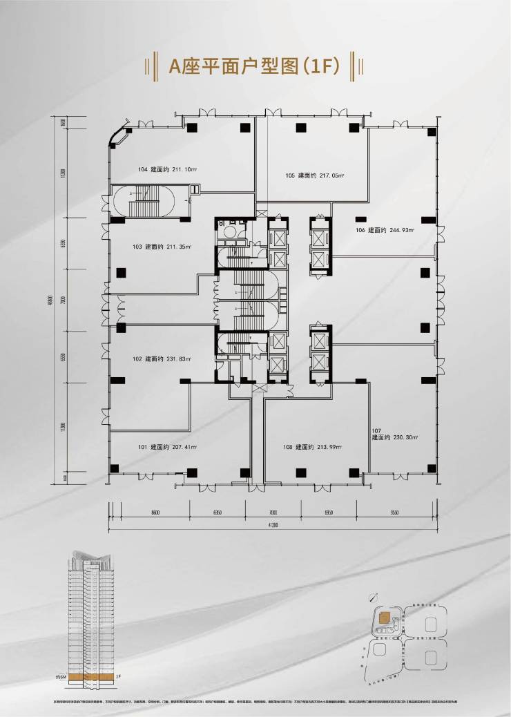 1 号楼办公:建面约 100-306㎡云端商务智慧空间 / 总裁会客厅。4-10 层挑高 5.40m,面积约 100-150-200㎡平层办公;17、19-23 层挑高 3.55m,面积约 200-300㎡。